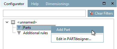 In order to insert parts into a configuration, at the item Parts, call the context menu command Add Part.