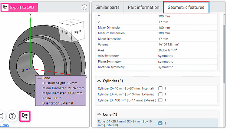 The information in the Geometric features dialog area is particularly interesting if the table does not contain any information (e.g. for custom parts). You have quick access to information such as dimensions, but also to individual features such as cylinders, cones, etc.