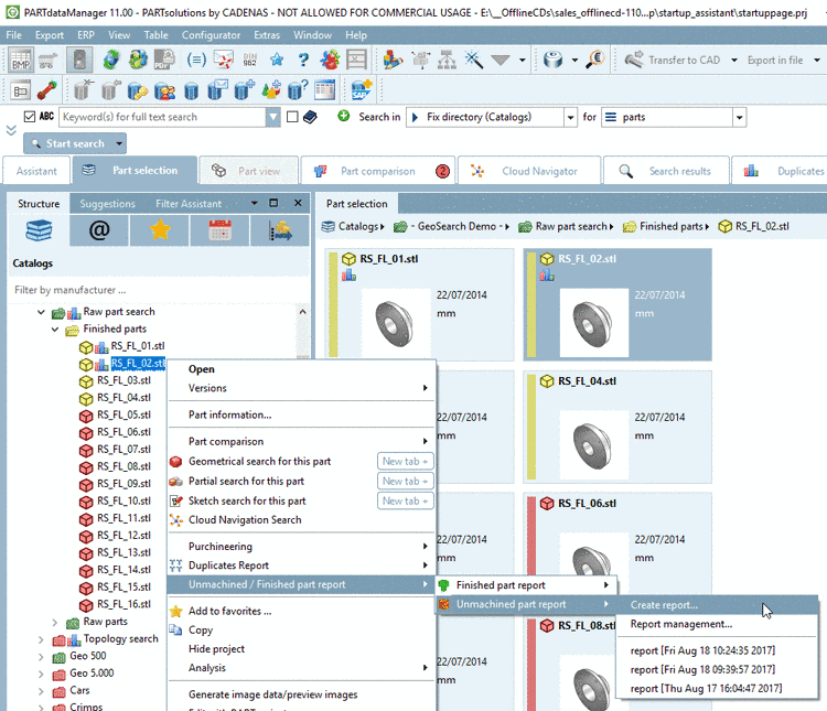 2. Select the context menu command under Search for unmachined/finished parts -> Unmachined part report -> Create report....