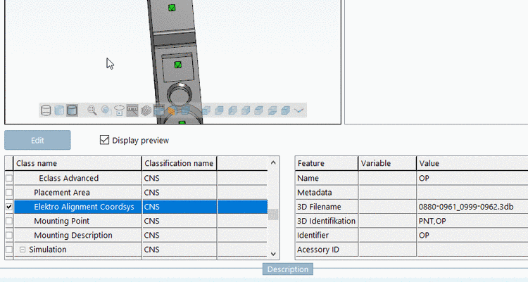 Classify the connection point that will be used as the orientation point as Elektro Alignment Coordsys. The name, identifier.... are filled out similarly to those of the electrical connection points.