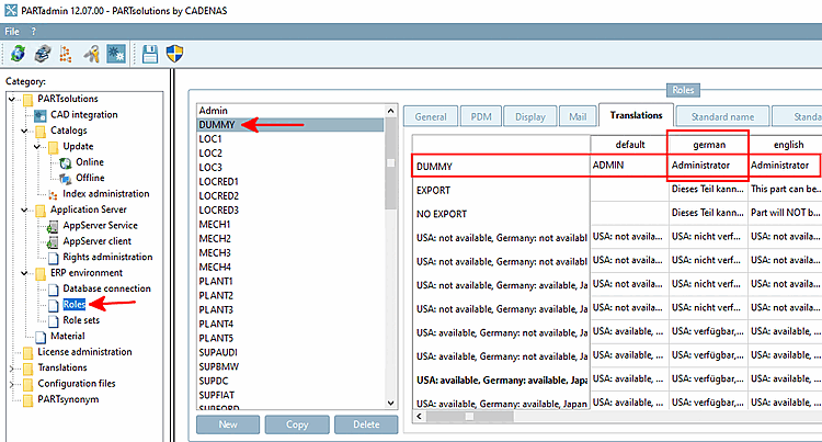 In the Roles dialog area, select the "ECAT3" role and the Translations tab page.