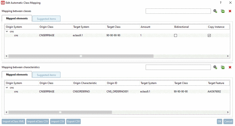 In the following example, a class attribute of the CNS classification shall be mapped to a class attribute of the eClass 9.1 classification. That means, beginning in the upper table (Mapping between classes), class data is entered and then attribute data in the lower table (Mapping between characteristics).