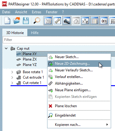 In the docking window 3D History, with the secondary mouse key, call the context menu of that Plane, where the sketch had been created and which shall be basis for the dimensioning view.