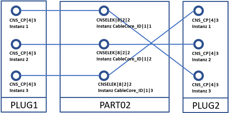On this level, the CNS class CNSELEK|5|7 (Inter Part Links) is working. This class enables to build connections between general class instances (two nodes [vertex]) on an abstract level. Please regard that in above example the single pins are instances of the class CNS_CP|4|3 (electrical connection); the cable cores are instances of the class CNSELEK|8|2|2 (cable core). Because of this above table has 6 connections. That means, a connection from the pins of part 1 on the left side to the core's left side and from the core's right side to the pins of part 2.