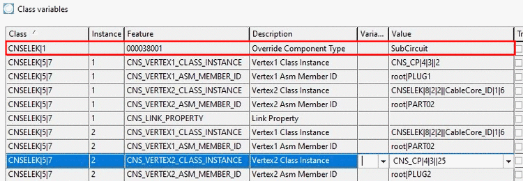 Subcircuits directly follow the above described general procedure. However, in order to explicitly create a subcircuit, on assembly level, the class CNSELEK|1 has still to be written with the feature Override Component Type, with the value "SubCircuit". This requires a consistent modelling of the Inter Part Links.