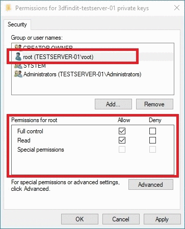 Click to add a local server user (in this case user „root“) to the list of users that have permissions to use the certificate.