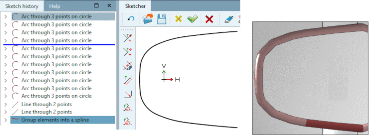 If a part has a curve with variable radius, you have to approximate their form by using several single arcs (Arc through 3 points on circle, see following figure). Now the spline feature enables to export a grouping instead of single arcs. As a result the error rate is reduced, especially when using the blend feature. Furthermore the depiction in 3D is more precise.