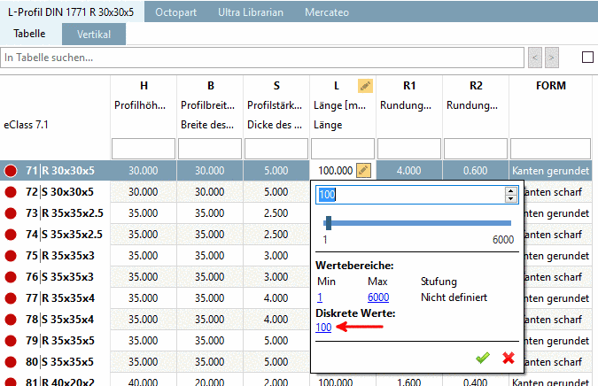 In PARTdataManager the value range is displayed under Value ranges, the default value under Discrete values in addition.