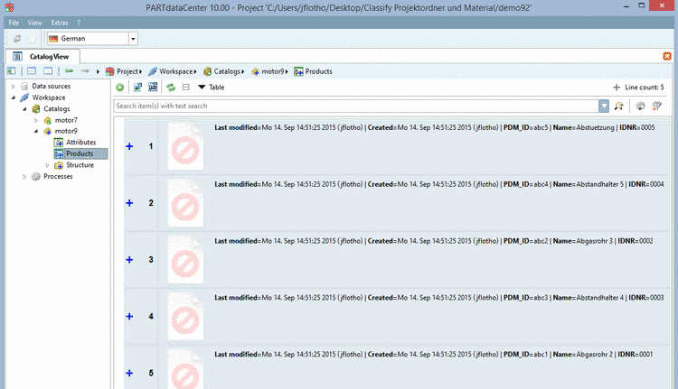 Geometries, preview images and technical views can be added in further working steps. On this see Section 1.3.5.3, “ Edit documents in product ”. If the table contains the PDM document number (in the above example "PDM_ID"), the PDM documents can be automatically accessed and respective processes be triggered via scripting solutions.