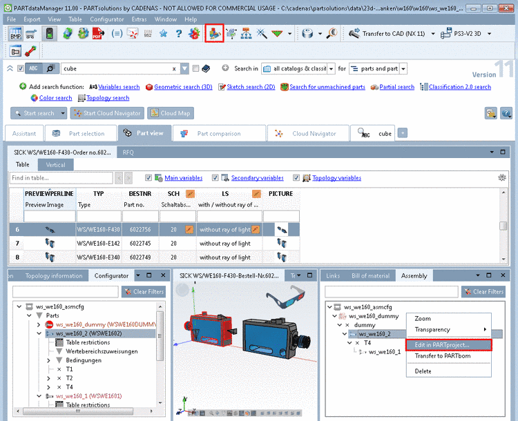 In the Configurator, select the part to be classified in the assembly and open it via context menu command in PARTproject.