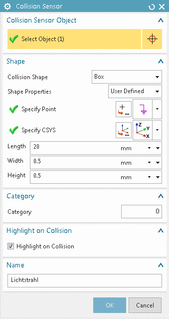 -> The dialog box Collision Sensor is opened.