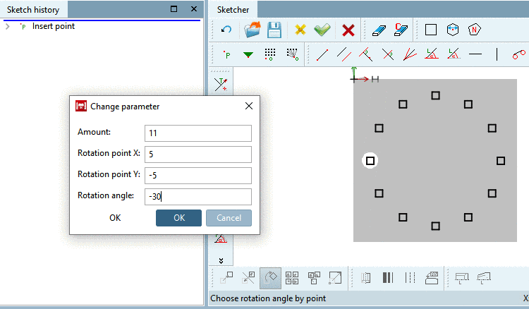 Adjust the values in input fields for Amount, Rotation point and Rotation angle and confirm with .