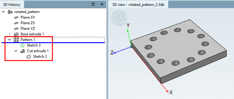 base point is in another sketch.In 3D History, mark the design steps Cut extrude and the sketch, which contains the pattern (here in example Sketch 3) and in the context menu, click Create pattern.