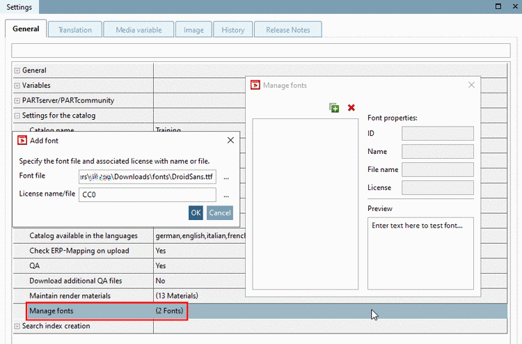 When clicking on the plus sign, the dialog box Add font is opened. Determine Font file and License name/file and confirm with .