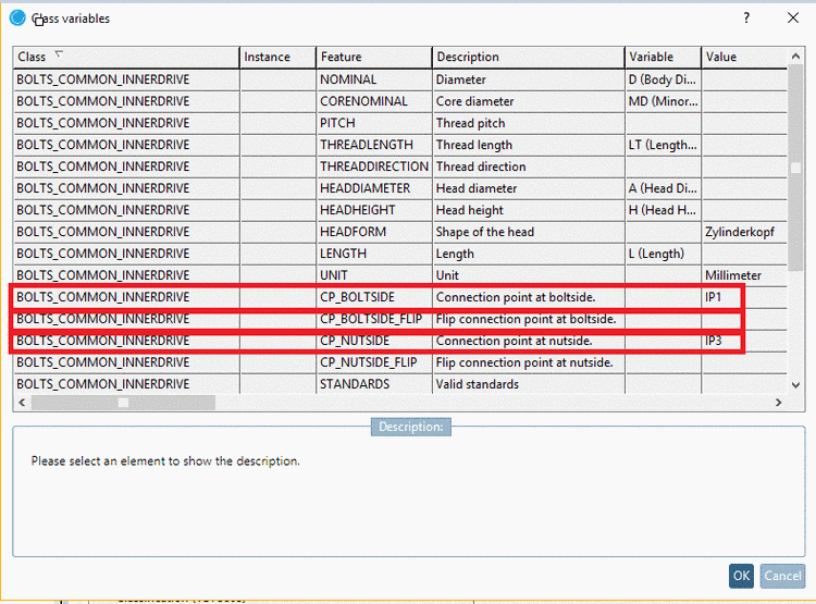 In the example in Fig. „Cylinder head screw with connection points“ the connection point IP1 (the connection point on the screw side) is assigned to the attribute "CD_BOLTSIDE" .