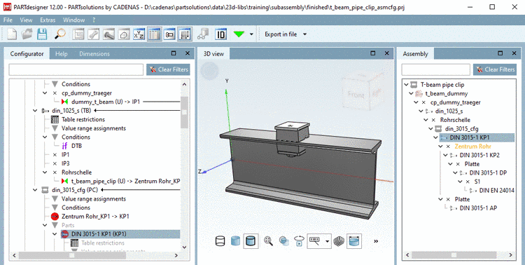 2. Enter a name (here "t_beam_pipe_clip") and define connection part (here "din_3015_cfg") and connection point (here "Zentrum Rohr_KP1")