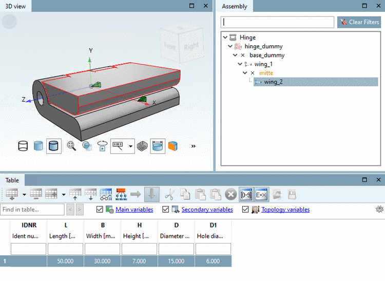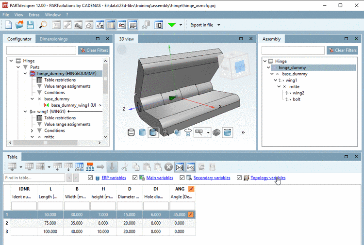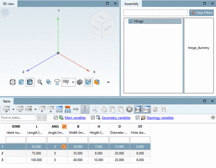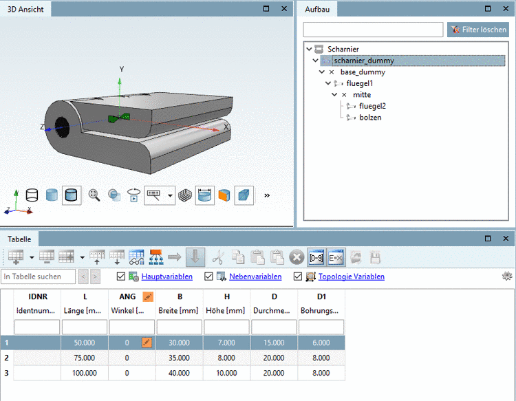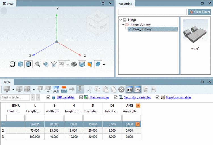 When selecting a table row the assembly is built up accordingly.