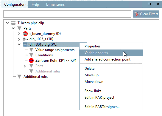 In the docking window Configurator, in the context menu of the pipe clip (din_3015_cfg, PC)", click the command Variable shares.
