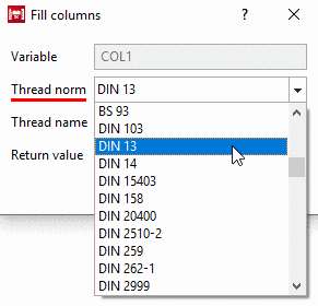 In order to fill columns with values from thread tables, in the column header of the table, use the context menu command Fill column with thread information. Values for nominal diameter (ND), pitch (PITCH), core diameter outer thread (KDA) and core diameter inner thread (KDI) can be entered.