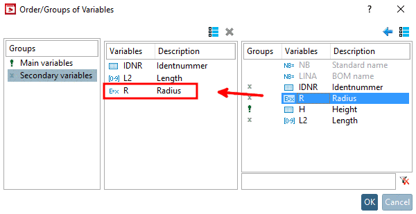 On the left side, select the group Secondary variables and then move the variable R into the middle field. Details on this can be found under Section 5.9.2.3.2, “ Order/Groups of Variables - Hide columns (variables) ”.