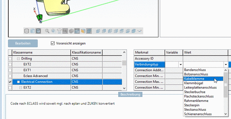 Information of parts already classified according to eCl@ss, can be mapped to the CNS classification. Otherwise 3D data in PARTsolutions (connection points classified as electrical connections) have to be equipped with additional information from data sheet.