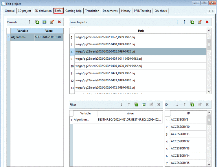 The function Enrich the catalog with accessory information provides the possibility to read mapping information from a CSV file. Then in PARTproject, on the tabbed page Links, the corresponding entries are automatically set and the accessory parts finally displayed in PARTdataManager.