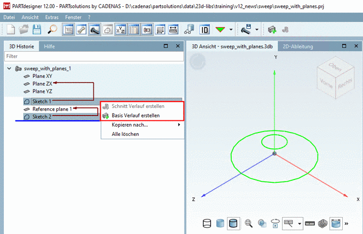With the standard variant, sweeps can be created via 2 parallel planes (they do not have to be on a plane mandatorily; the creation of a sketch in the 3D view via Generate sketch on selected face is also possible). The sweep's creation is performed by selecting two sketches and the context menu command Create sweep base or Create sweep cut.