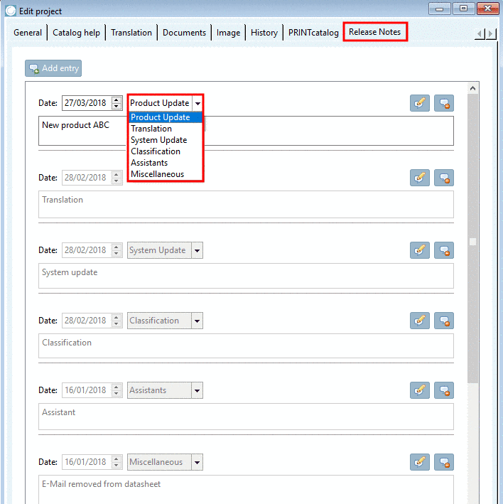 In order to set new release notes, proceed as described below. At the latest before publishing anew the Release Notes have to be set (see Section 6.10, “ Publish catalog ”).