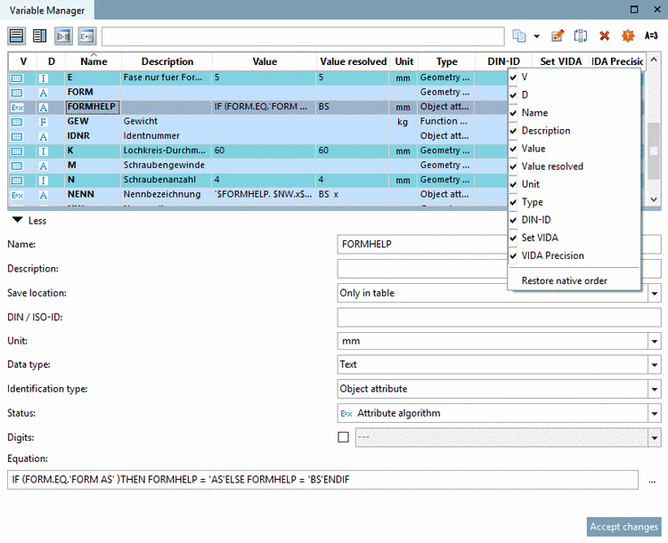 If under Status, the option Variable with fixed values is selected, the checkbox is grayed out and the specification of decimal places is mandatory. The table column Set VIDA shows the entry "true".