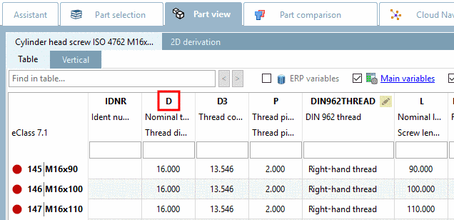 The DIN-ID contains the dimension letter from the dimensional and/or product standard. For the Nominal diameter of a screw, for example, it may be D1. Dimension letters such as Greek letters (alpha for example), can be written out as a word.