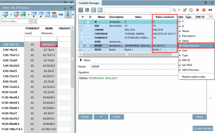Data are saved in the respective *.tab file. Table values can directly be edited in the PARTdesigner user interface.