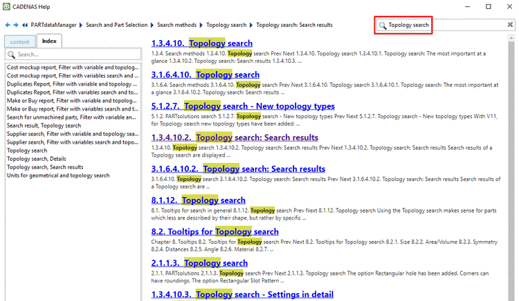 In the index view you will get an alphabetical listing of all index terms. Simply select the desired term, in order to display the respective help.