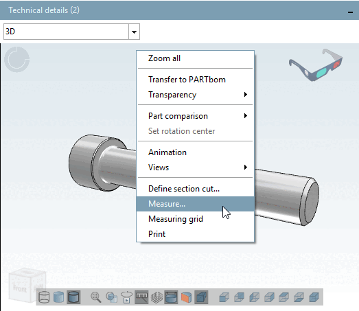 Detailed information on the trade fair dialog [Measure dialog] can be found under Section 3.1.7.6.3, “ Measuring 3D parts ” in ENTERPRISE 3Dfindit (Professional) - User.