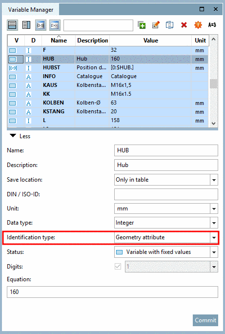 The Standard name must be unique for all lines and value range inputs. That means, if variable parameters are changed by selecting table lines and / or value ranges and the geometry is changed through this, the NB has to change, too. This happens e.g. at stroke positions and angularities, change of dimensions (length, width, hight, ...) and conditioned geometrical buildup of components. During export to CAD or when saving neutral formats, the NB with currently set variable parameters is transformed to a filename.