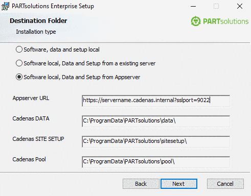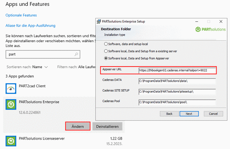 CADENAS_APPSERVER=https://servername.cadenas.internal?sslport=9022&inethelp=1If you want to switch to WebHelp later, call the installation procedure via Windows Start menu -> Add or remove programs again.
