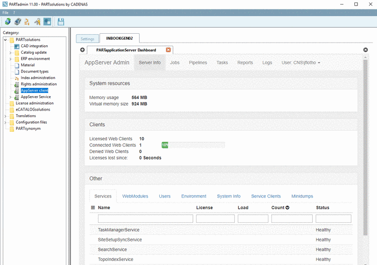 On the single tabbed pages you will receive a lot of information: Connected clients, via which modules, etc. You can check environment variables or view different server processes (Jobs), create tasks and administrate pipelines and more.