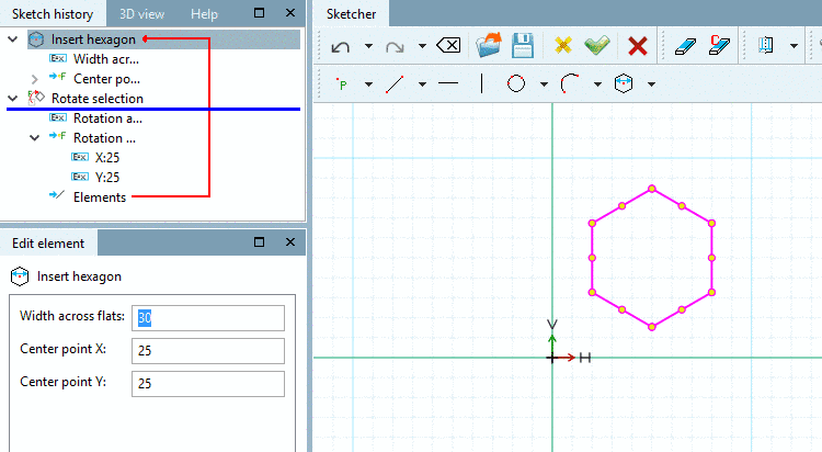 -> In the docking window Edit element, now the view changes to Insert hexagon. Here, you can adjust Width across flats, furthermore, also here, the center point of the hexagon via Center point X and Center point Y.