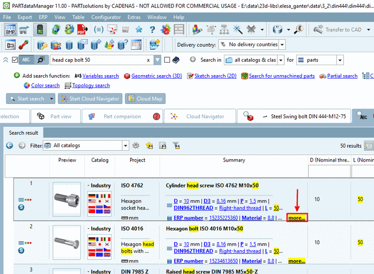 In the following example a search for "head cap bolt" and the numerical value "50" has been performed. Search terms are marked with yellow color.