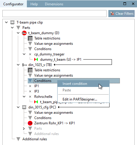 For the "Double T-beam (T)" component, call up the context menu command Insert condition under Conditions.