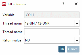 As of V11 SP8 columns can not only be filled with (calculated) values of other columns (context menu command Fill columns), but also with values from the thread tables (context menu command Fill column with thread information). Values for nominal diameter (ND), pitch (PITCH), core diameter outer thread (KDA) and core diameter inner thread (KDI) can be entered.