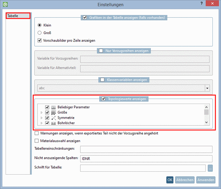 Topological variables can be displayed beside the standard table information. With the checkbox Topology variables you can activate / deactivate the display if needed. Especially at own part catalogs characteristic values are not necessarily in the characteristic attribute table. In this case the display makes sense in particular.[18]