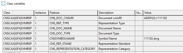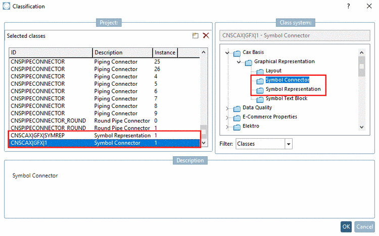 7. Set the classes CNSCAX|GFX|SYMREP (Symbol representation) and CNSCAX|GFX|1 (Symbol connector) and for each, enter the instance number.