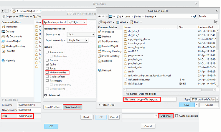 STEP Export Profile Settingsvia "File > Save As (Type=STEP ) > ", for example.Under Application log, select the "ap214_is" option and deactivate the Hidden elements option.