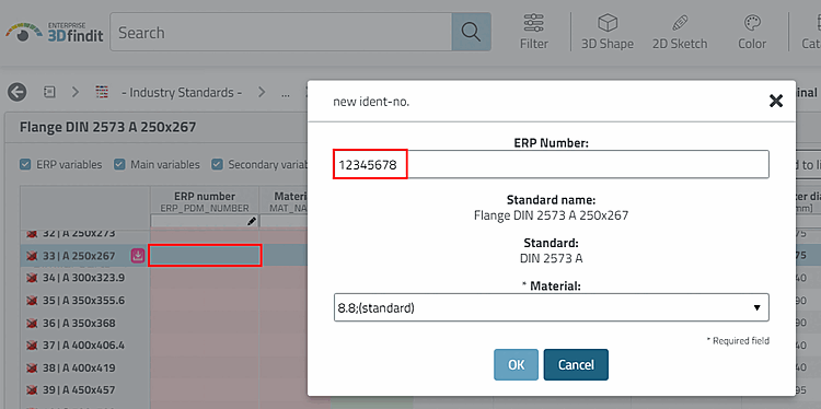 If you now call up the New ident number [new ident-no.] dialog in 3Dfindit, the input field for the ERP number [ERP Number] is active.
