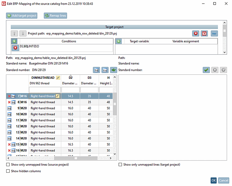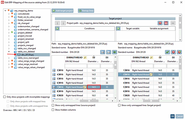 Select rows with assigned target project -> The table of target project is displayed on the right. The correct row is marked .