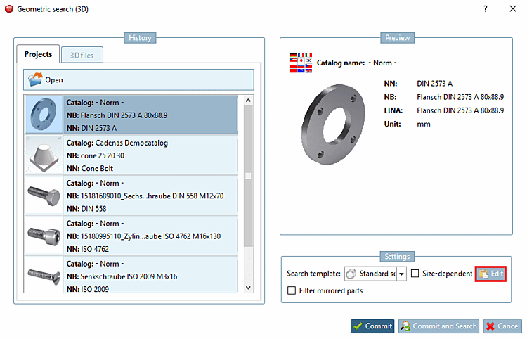 To edit the search templates, the Edit button can be made visible in the Geometric search (3D [Geometric search (3D)] ) dialog box. The following settings must be made for this: