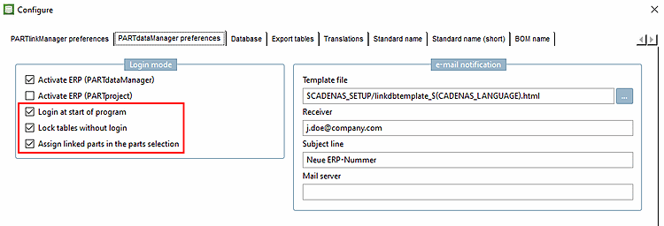 PARTlinkManager -> Extras menu -> Configure ERP environment -> Configure dialog window -> tab page PARTdataManagerSettings [PARTdataManager preferences] -> Login mode section