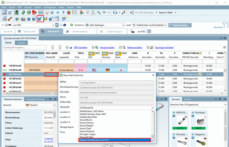 If the part to be exported does not show an ERP_PDM_NUMBER and material in PARTdataManager, then in the ERP toolbar, open the dialog box new ident-no. by clicking on Add dataset to link database