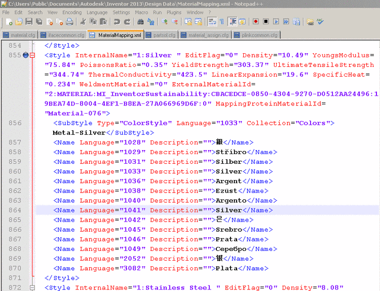 Open "Public Documents \ AutoDesk \ Inventor \ Design Data – MaterialMapping.xml".