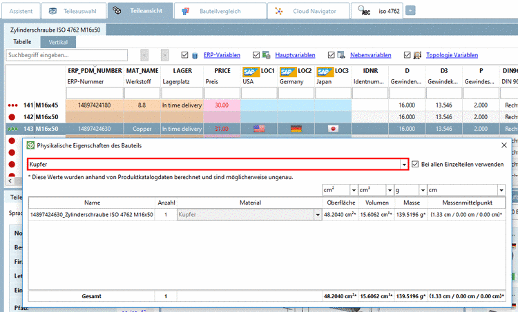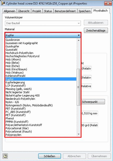 material.cfg(NOTmaterial_assign.cfg), then the physical properties are correctly calculated in PARTdataManager, under Physical properties of the part. In the list field, select the desired material.Material attribute in CAD system